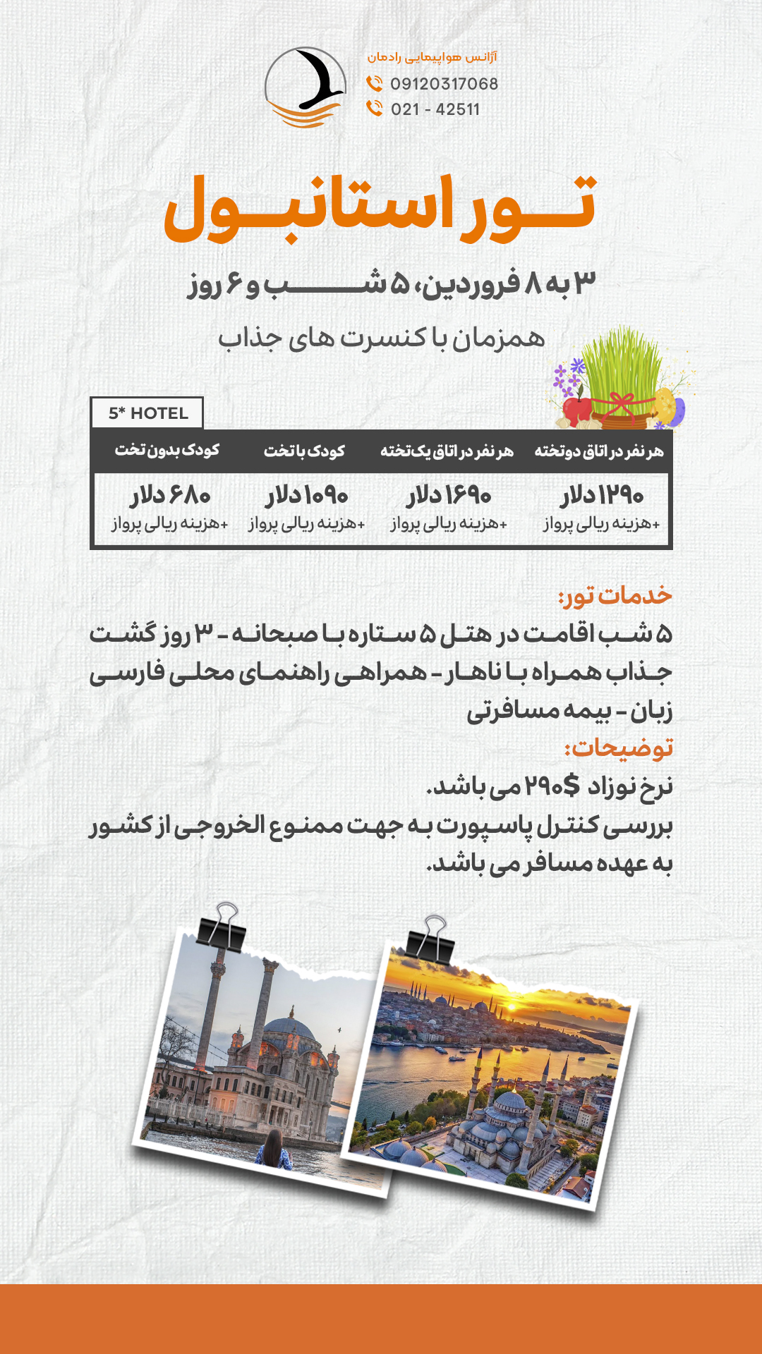 کودک زیر 2 سال نوزاد محسوب می شود و نرخ آن 290 دلار می باشد.