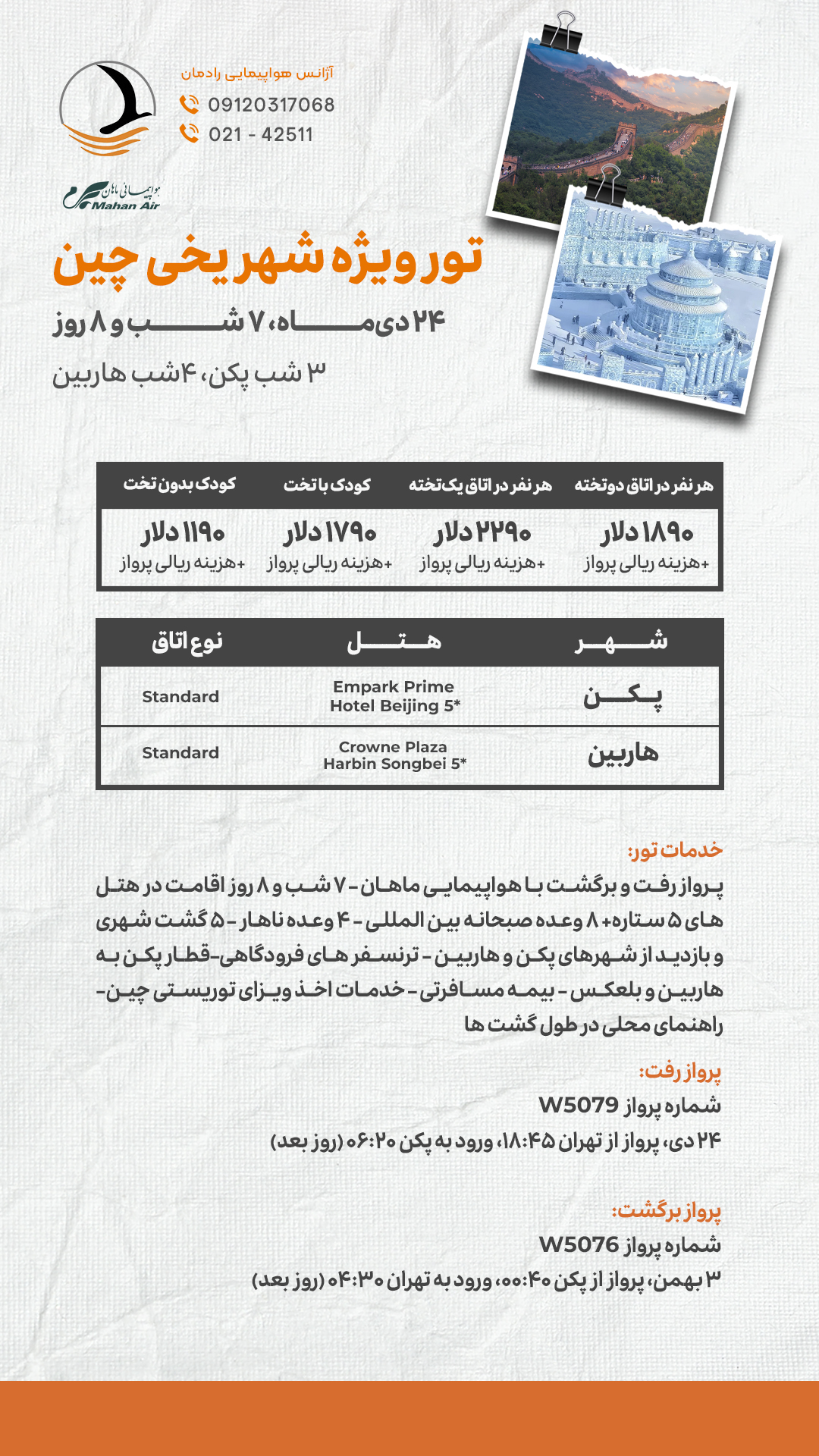 | پرواز: | پرواز به صورت مستقیم با شرکت هواپیمایی ماهان انجام می پذیرد و به قیمت تور اضافه خواهد شد |